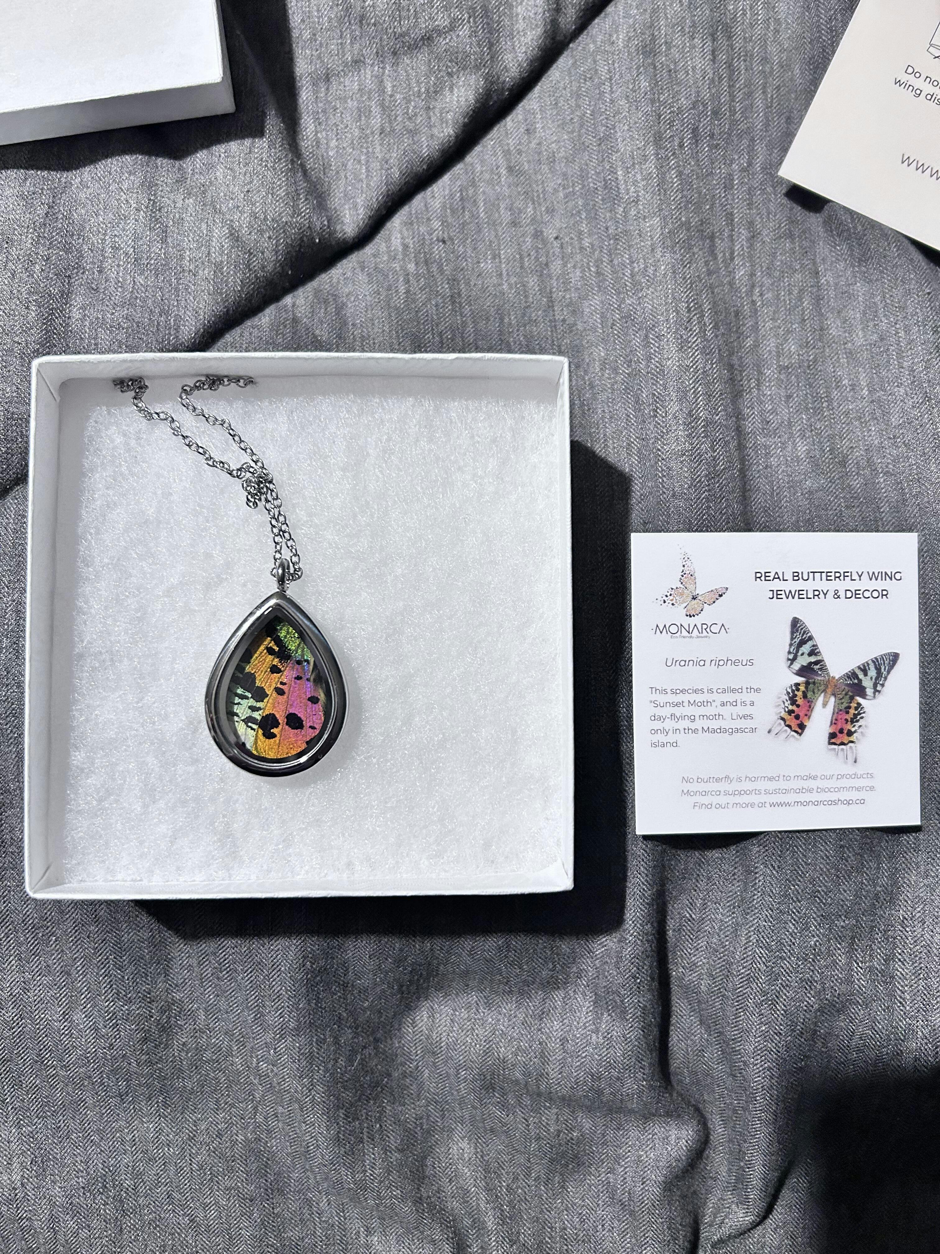 No butterfly is harmed or collected from the wild to make our jewelry. The butterfly wings are sent to us from breeding farms once the butterflies have expired.